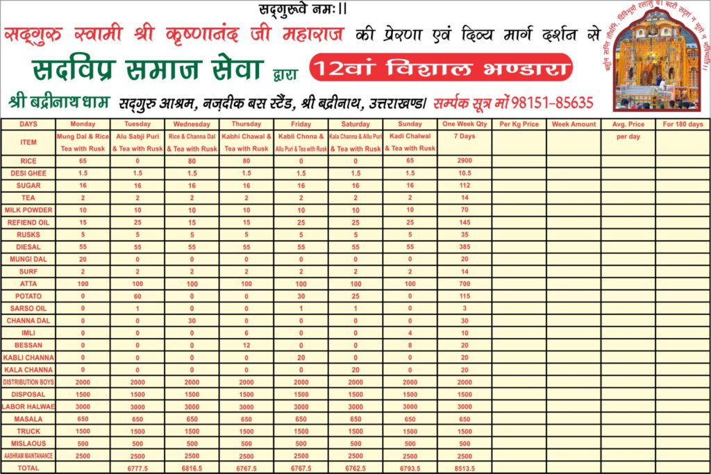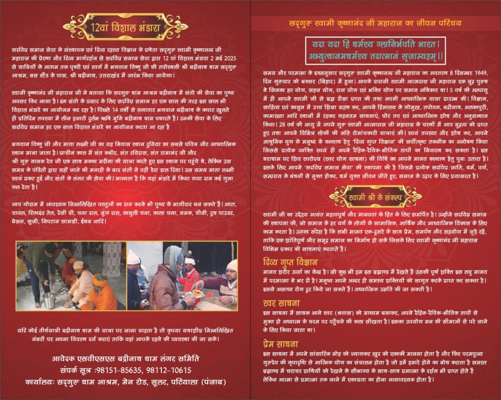 हर साल की भांति इस साल भी बद्रीनाथ के सद्गुरु धाम आश्रम में संतों की सेवा का पुण्य अवसर फिर से लौट आया है। इसी अवसर को देखते हुए सद्विप्र समाज एक बार फिर से विशाल भंडारे का आयोजन कर रहा है। इसके लिए 02 मई की तिथि निर्धारित की गई है। इसलिए जो लोग बद्री विशाल के शरण में पहुंचे संतों की सेवा करना चाहते हैं वह स्क्रीन पर दिए गए नंबर पर कॉल कर सकते हैं।